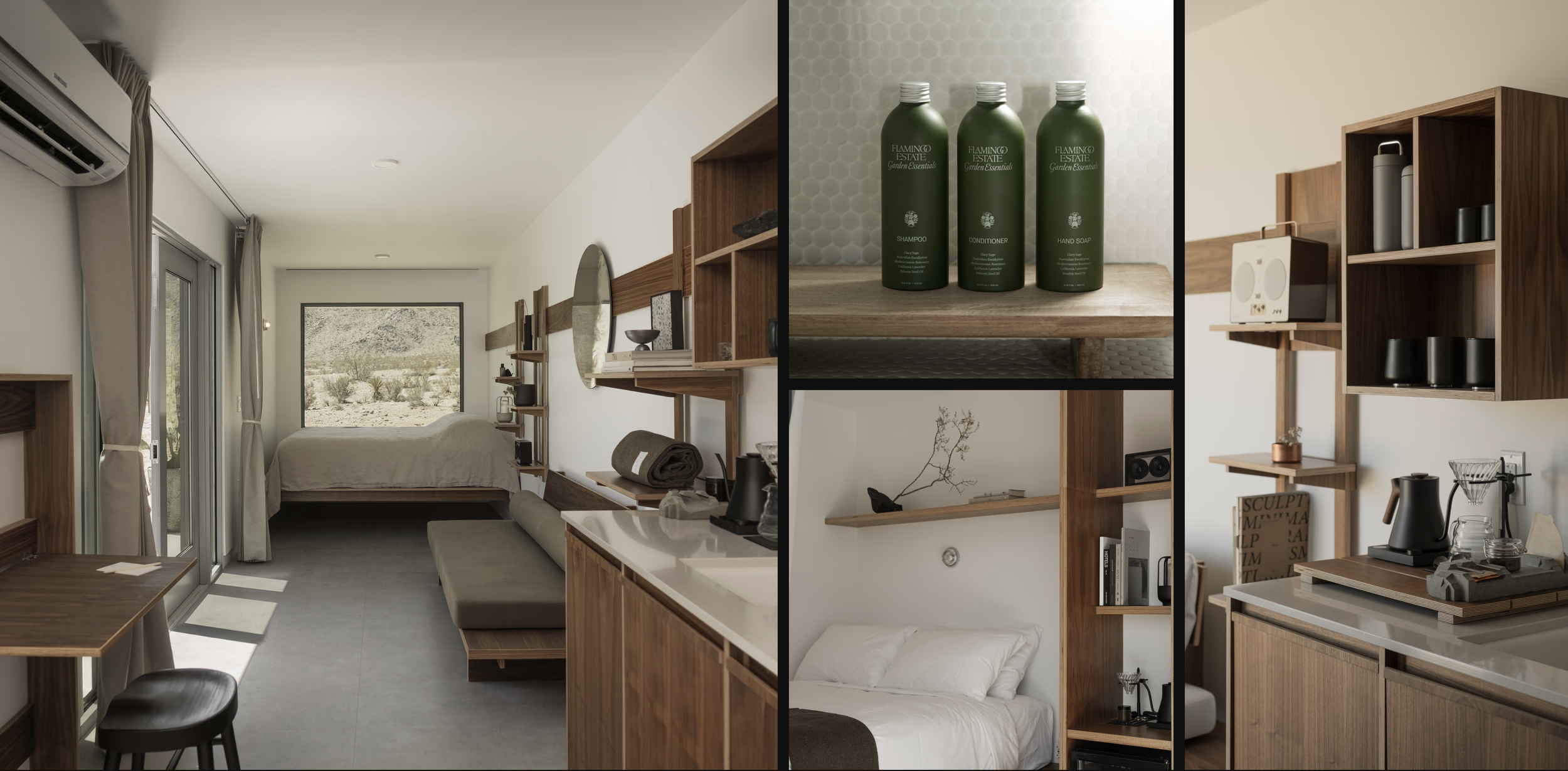 Much of the project was resolved off-site in Ontario, where the suites could be produced under controlled conditions before being transported to the California desert and craned into place. That approach turned a remote site into a coordinated act of manufacturing, logistics, and design, reducing uncertainty, improving quality control, and proving that even a highly atmospheric hospitality project can be delivered with the discipline of an industrialized system.
